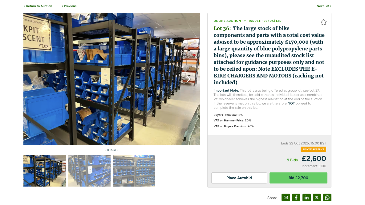 Casi £200.000 en piezas de bicicletas están a la venta en el Reino Unido, ya que los activos del minorista de bicicletas YT Mill, con sede en Guildford, se venden en una subasta.