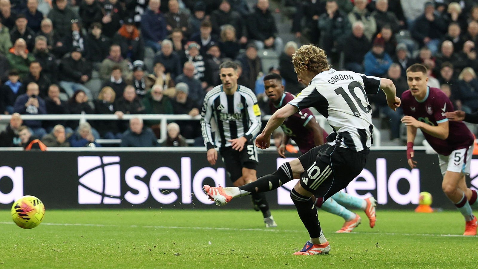 Anthony Gordon toma el córner desde la banda izquierda, creo que ganó ese córner, también creo que pudo haber ganado el córner desde el que anotó Bruno, tal vez mi memoria me jugó una mala pasada en ese, porque tal vez no lo hizo. De todos modos, el peligroso córner de Gordon es atendido por el defensa del Burnley y concedido un penalti.