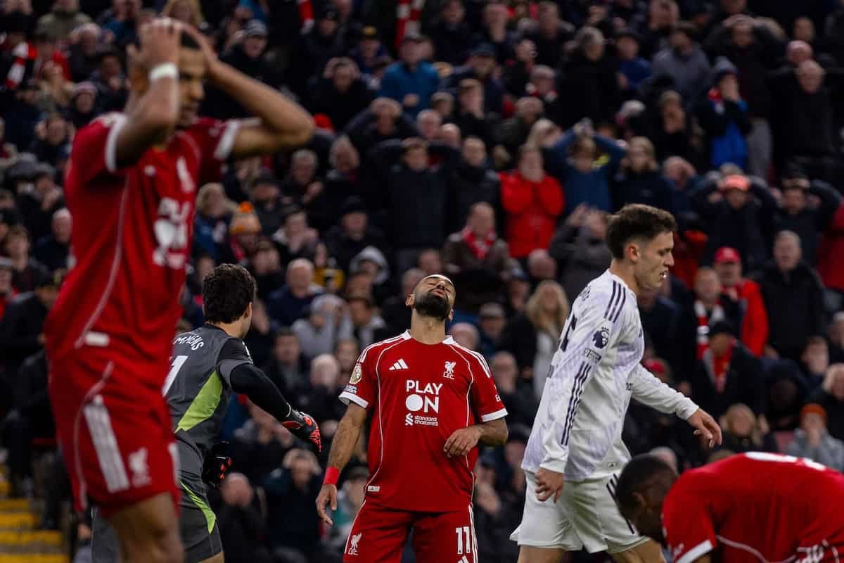 LIVERPOOL, INGLATERRA – Domingo 19 de octubre de 2025: Mohamed Salah del Liverpool reacciona después de perder una oportunidad durante el partido de la FA Premier League entre el Liverpool FC y el Manchester United FC en Anfield. (Foto de David Rawcliffe/Propaganda)