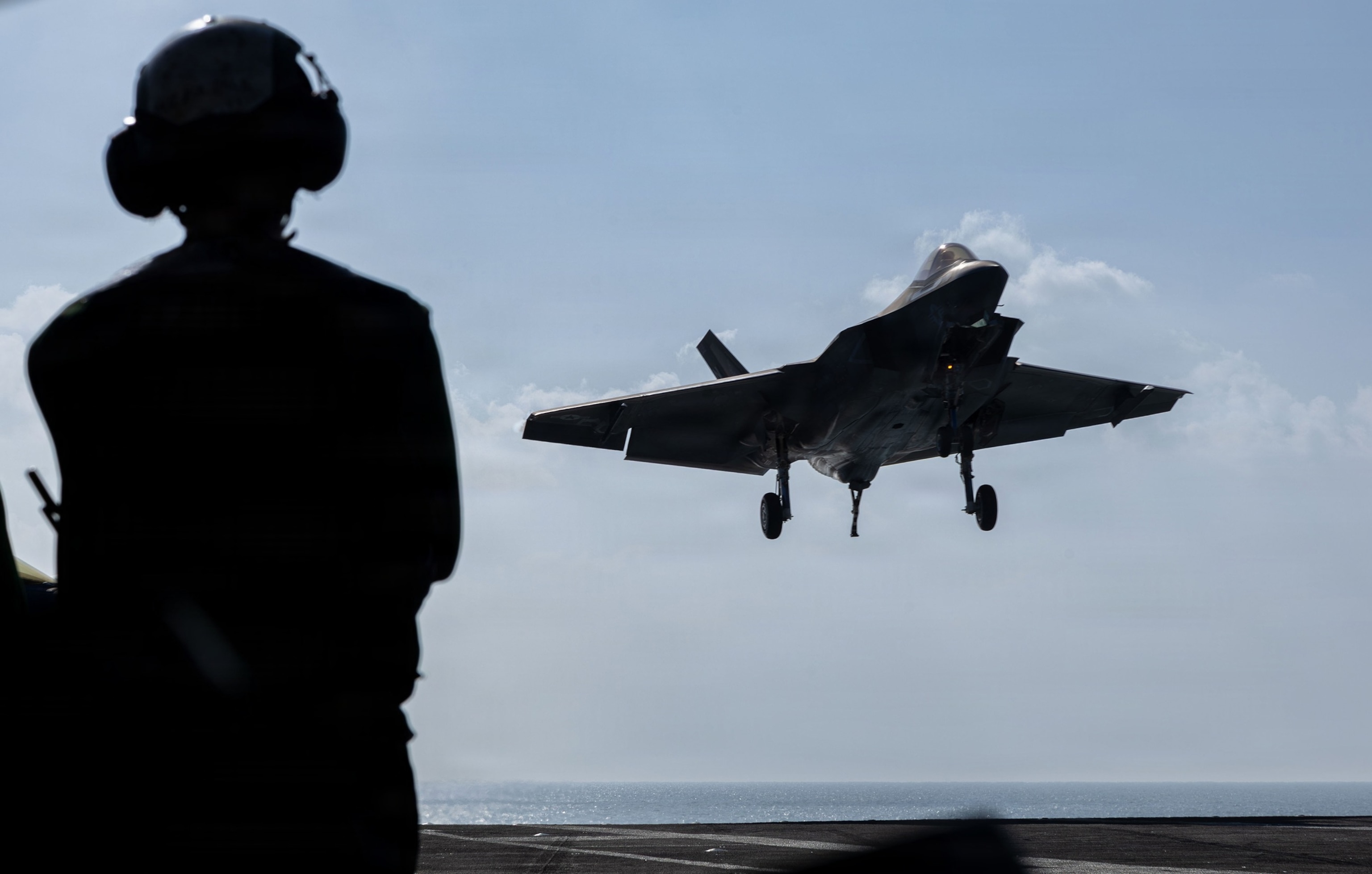Un F-35C Lightning II, adscrito al Marine Fighter Attack Squadron 314, se prepara para realizar un aterrizaje detenido en la cubierta de vuelo del portaaviones clase Nimitz USS Abraham Lincoln en el Mar Arábigo, el 12 de febrero de 2026.
