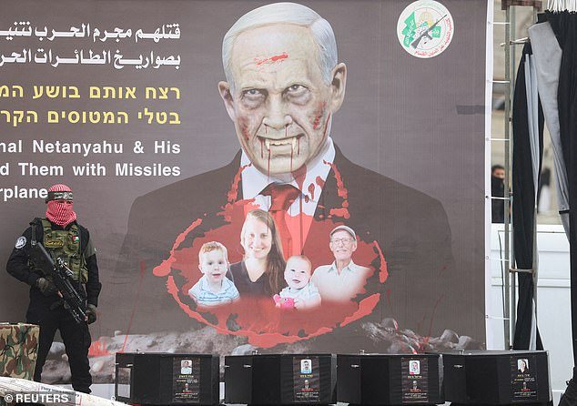 Un activista de Hamás se encuentra cerca de los ataúdes durante la entrega de rehenes fallecidos en febrero de este año.