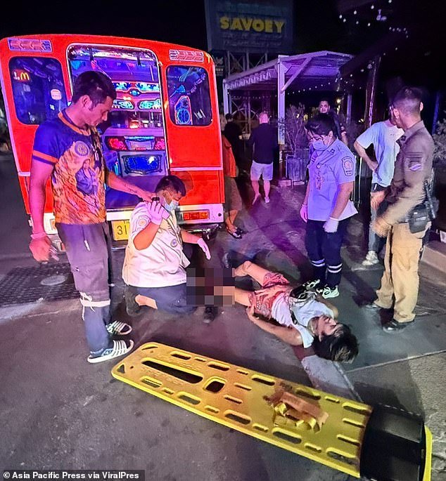 El hombre que estaba en el suelo, vestido con una camisa blanca, fue transportado en la parte trasera de una ambulancia y trasladado al Hospital de Patong para recibir tratamiento. En el lugar donde había sido atacado quedaba un gran charco de sangre.