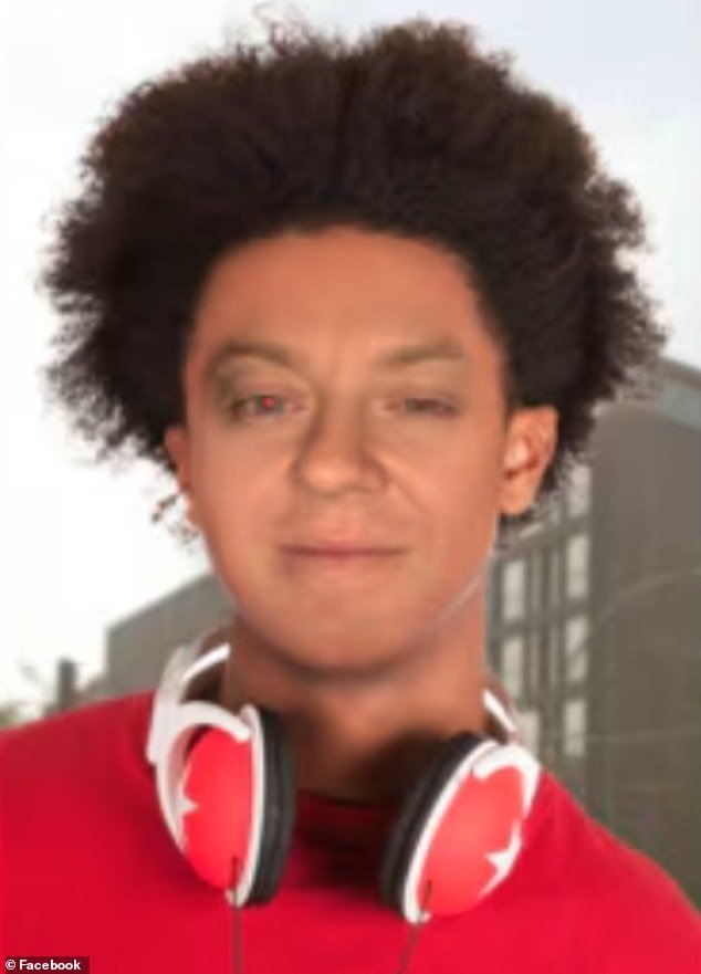 El Sr. Curtain fue visto en la foto con una tez más oscura visiblemente oscura, llevando un afro, con un juego rojo de auriculares envueltos alrededor de su cuello.