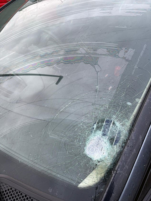 Impactantes imágenes muestran los daños causados al vehículo. En el interior del coche había fragmentos de cristal, incluido el del niño pequeño, antes de que lo limpiaran y lo llevaran para repararlo.