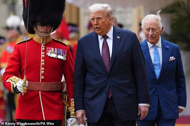 La última vez que el Sr. Trump se entregó a toda la bomba y la ceremonia de una visita estatal en 2019, se enfrentó a acusaciones de violación del Protocolo Real después de haberse puesto antes del final de la Reina Isabel II durante la inspección de la Guardia Honoraria en Windsor.