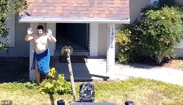 Después de que Abuharbieh se negara a cumplir con las demandas de los oficiales, los equipos SWAT descendieron a la casa y él salió con una toalla, como se muestra en la foto de arriba.
