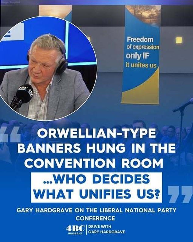 El ex ministro de educación gubernamental de Howard y ahora 4 presentador de la BBC Drive, Gary Hardgrav Queensland, el Partido Liberal del Partido Liberal es un eslogan que cuelga dentro de la conferencia estatal del Partido Nacional Liberal, creía que pasó más de ocho minutos contra él.