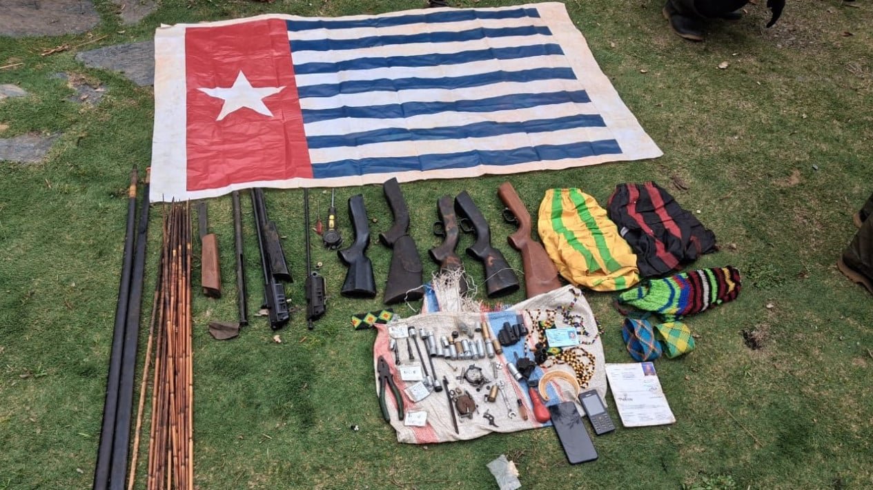 Además, también se encontraron equipos de comunicación: varios teléfonos móviles y walkie-talkies (HT), banderas de OPM, así como documentos de identidad y otros equipos personales.
