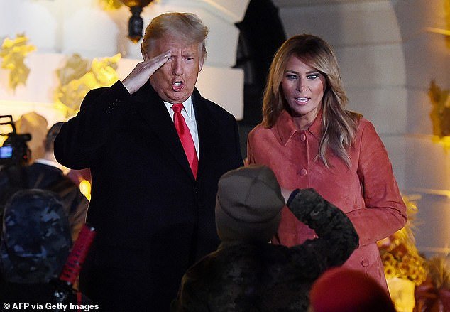 El presidente Donald Trump, acompañado por la primera dama Melania Trump, coloca una barra de chocolate en la cabeza de un niño disfrazado de Minion durante un evento de Halloween en el jardín sur de la Casa Blanca, decorado para Halloween, el lunes 28 de octubre de 2019.