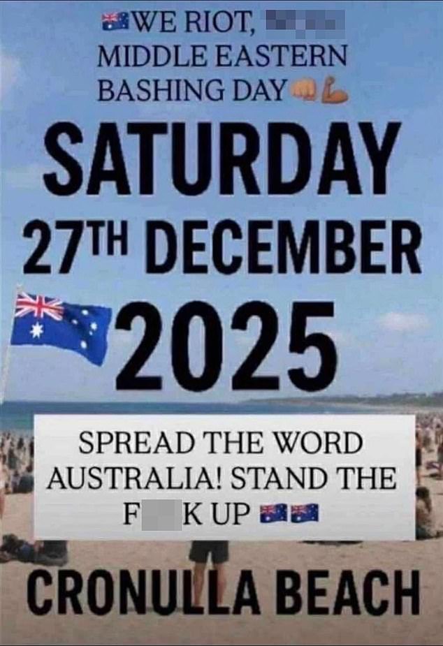 El volante, que fue ampliamente compartido en Snapchat, Facebook y TikTok, anunciaba un “día de difamación” previsto en Cronulla Beach, al sur de Sydney, el 27 de diciembre.