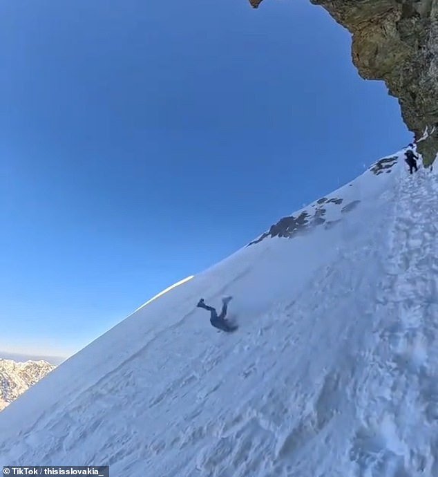 Imágenes impactantes filmadas desde el casco de un compañero muestran el aterrador momento en que un hombre cae desde el pico más alto de Polonia.