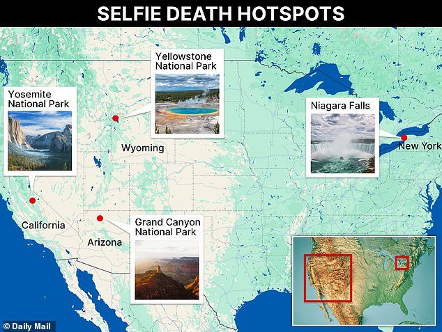 Las mejores ubicaciones estadounidenses donde los selfies mortales son los más comunes se encuentran en el Gran Cañón de Arizona, en el Parque Nacional Yosemite en California, Niágara Falls, Nueva York y el Parque Nacional Yellowstone de Wyoming