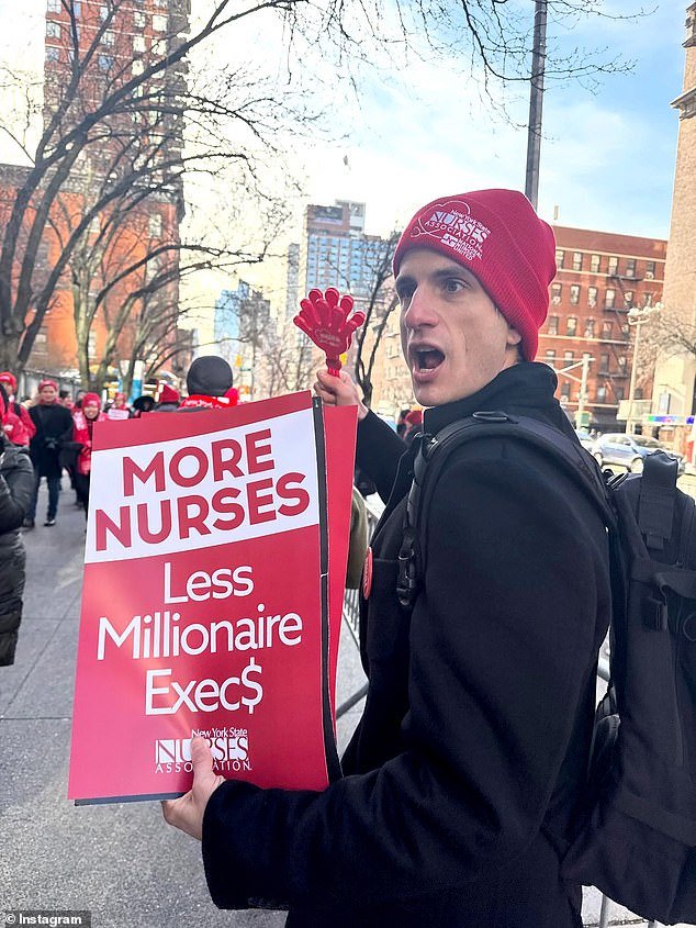 Para conmemorar su regreso al campo, Jack Schlossberg, de 32 años, participó en una manifestación con la Asociación de Enfermeras del Estado de Nueva York después de que 15.000 de ellas se declararan en huelga el 12 de enero.