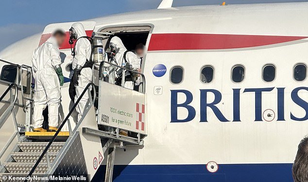 Es un momento dramático bombero en todo el equipo de Hajmat en un vuelo de British Airways desde Londres a un aterrizaje de emergencia en Italia.