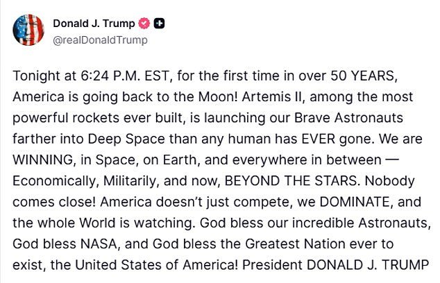 “¡Esta noche a las 6:24 p.m. EST, por primera vez en más de 50 AÑOS, Estados Unidos regresa a la Luna! Artemis II, uno de los cohetes más poderosos jamás construidos, lanza a nuestros valientes astronautas al espacio profundo más lejos de lo que cualquier ser humano jamás haya llegado”, escribió en Truth Social.