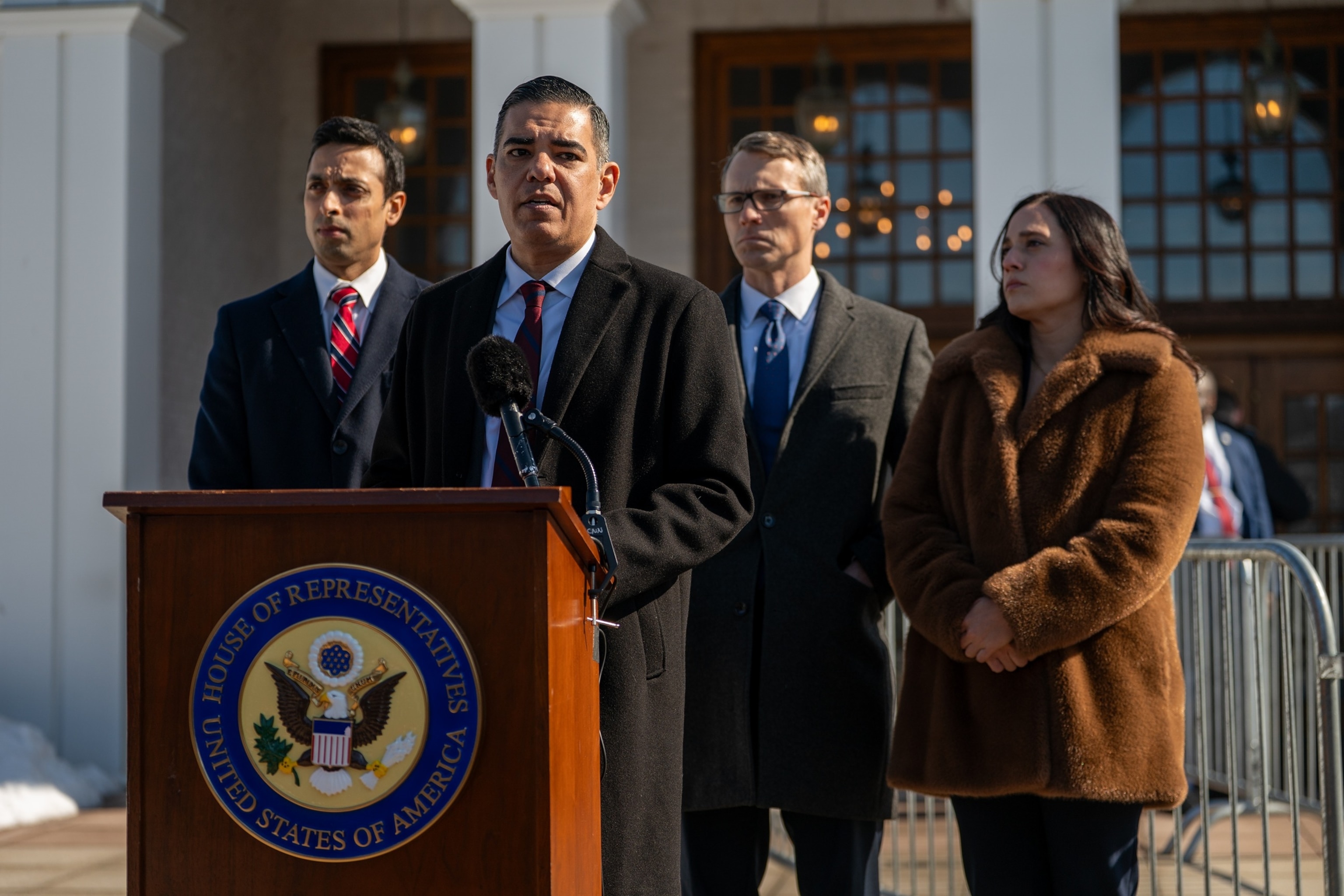 El representante Robert García, acompañado por miembros demócratas del Comité de Supervisión de la Cámara de Representantes, habla con miembros de los medios de comunicación antes de una declaración a puerta cerrada con la ex Secretaria de Estado de los Estados Unidos, Hillary Clinton, el 26 de febrero de 2026 en Chappaqua, Nueva York.