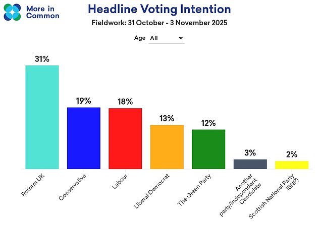 La encuesta Más en común, realizada entre el 31 de octubre y el 3 de noviembre, es aún más sombría para Sir Keir que otra encuesta de YouGov publicada ayer.