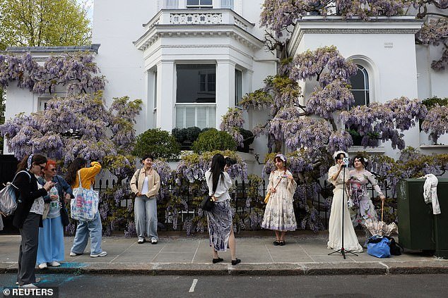 Grandes grupos de turistas e influencers han recorrido algunas de las calles más elegantes del oeste de Londres para admirar las glicinas en flor.