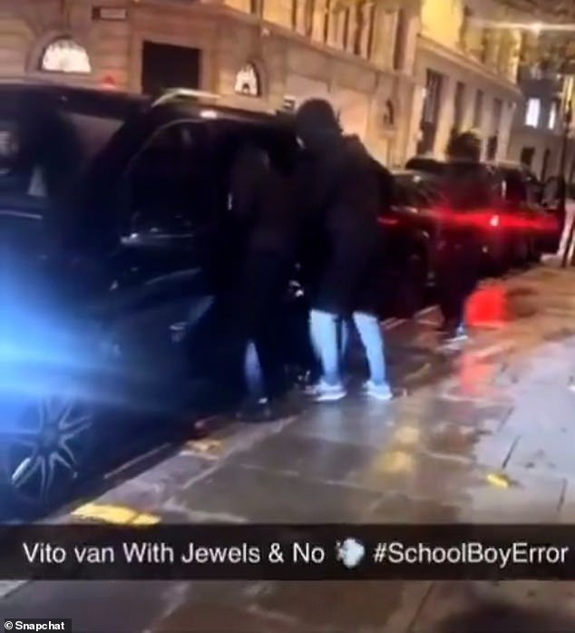 El grupo de al menos cuatro personas, vestidas con jeans y abrigos largos con capucha negros, fue filmado rodeando una camioneta Mercedes negra en una calle de Square Mile el domingo.