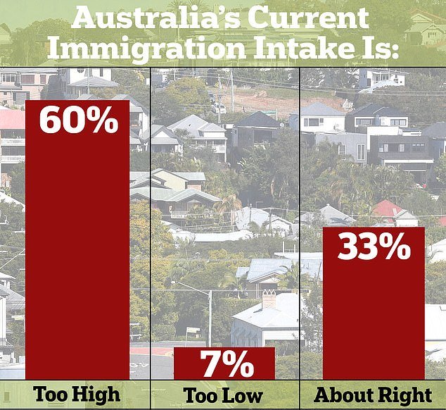 Un enorme 60 por ciento de los encuestados cree que los niveles de inmigración de Australia son demasiado altos, mientras que sólo el 7 por ciento piensa que son demasiado bajos.