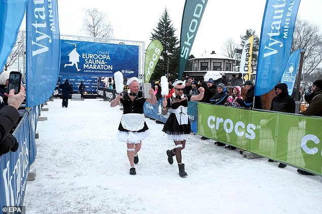 Dos sirvientas alegres desafían las gélidas temperaturas para participar en el maratón europeo de saunas