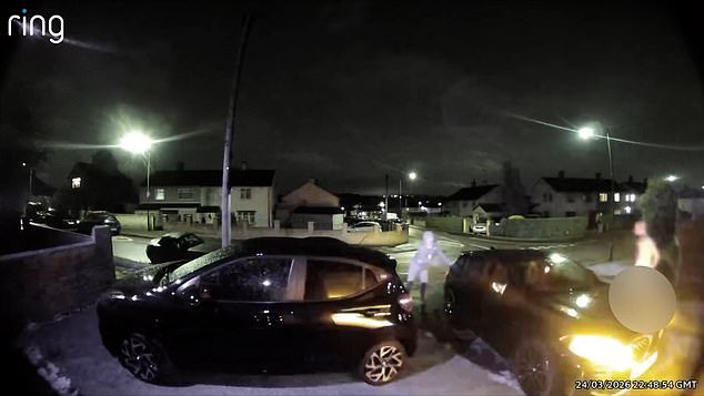En el primer incidente, se puede ver a una figura encapuchada intentando irrumpir en vehículos a altas horas de la noche antes de ser ahuyentada por Aaron Thompson, de 43 años, un hombre desnudo, que ni siquiera tuvo tiempo de vestirse.