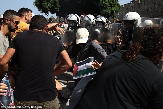 Los manifestantes palestinos se enfrentaron con disturbios en Rhodes durante un crucero israelí en la isla griega