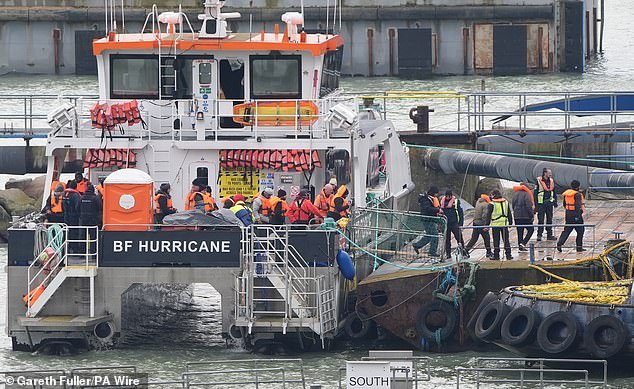 Un grupo de migrantes desembarcó hoy en el catamarán de la Fuerza Fronteriza, Hurricane, en Ramsgate.