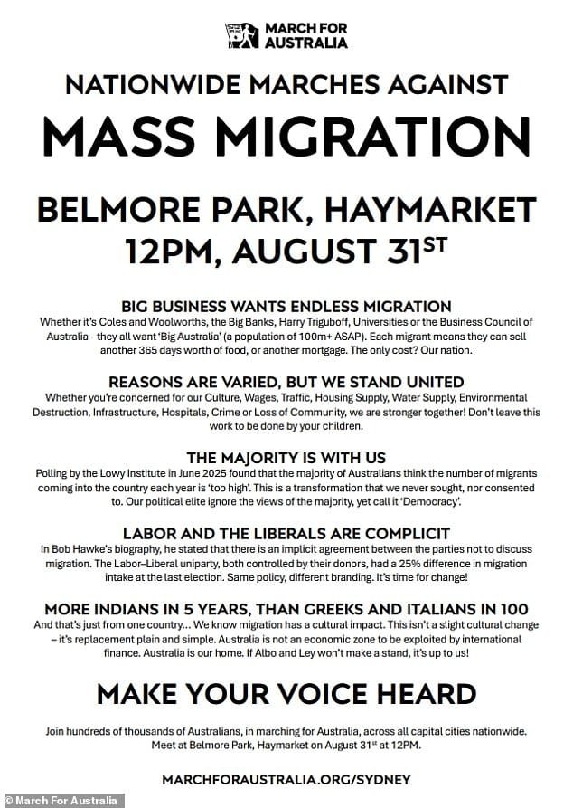 El Grupo de Inmigración de Inmigración en nombre de Australia ha publicado un anuncio preocupante antes de la marcha nacional, que ha prometido enfrentarse a él como una “inmigración interminable”, alegando que es administrado por grandes empresas y respaldado por grandes partidos políticos.