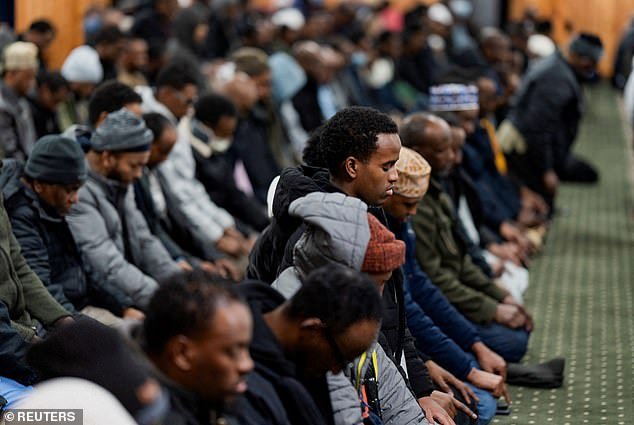 Los hombres participan en una sesión semanal de oración Jum’ah los viernes en el Centro Islámico Abubakar As-Saddique, parte de una operación federal de inmigración en curso dirigida a la comunidad somalí en Minneapolis el 5 de diciembre.
