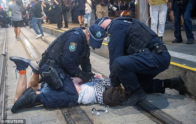 Durante las caóticas protestas en Sydney el lunes por la noche, provocadas por la llegada del presidente israelí Isaac Herzog, se vio a dos agentes de policía de Nueva Gales del Sur golpeando repetidamente a un hombre inmovilizado.