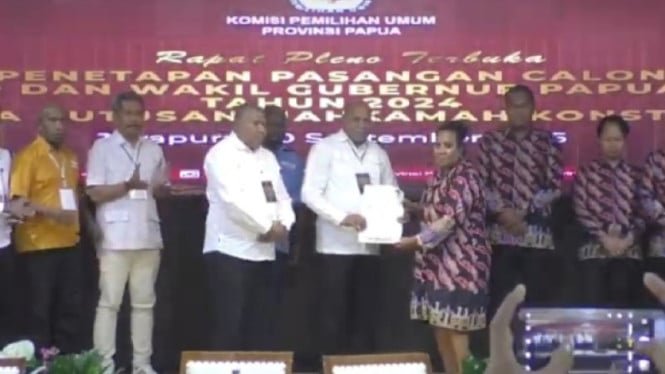 Papua KPU en su decisión de determinar el par de candidatos número dos Matthew-Ayoko rumaropen con 259,817 votos o 50.4% del total de votos válidos como gobernador y subicobernamental de Papua elegido para el período 2025-2030.