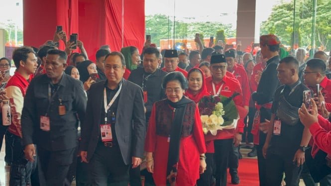 Según el monitoreo de VIVA en el lugar, Megawati llegó alrededor de las 2:00 p.m. WIB. Llegó vestido con ropa roja y negra y un chal.