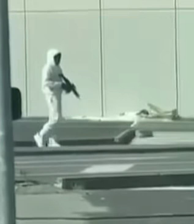 Las imágenes muestran a una persona vestida de blanco blandiendo un arma de fuego de imitación en McRae Street, en las afueras de Dandenong Plaza, en el este de Melbourne, alrededor de las 11 a. m. del martes.