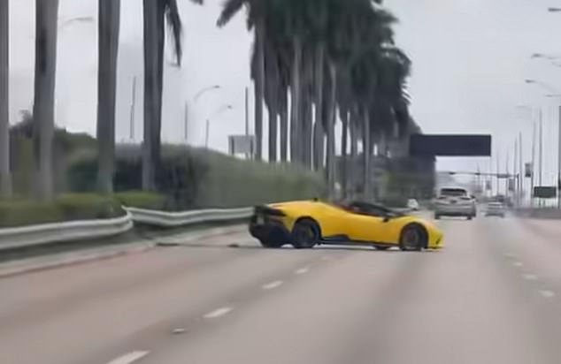 Se tomó un conductor de Lamborghini exceso de velocidad en la cámara perdiendo el control del costoso auto deportivo antes de aplastarlo en la barandilla a ambos lados de un camino animado de Miami.