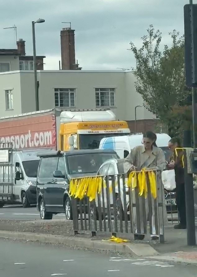 Otras dos mujeres fueron filmadas para demolir cintas amarillas para rehenes judíos un día después de que un artista judío palestino las retiró de las barandas en Londres.