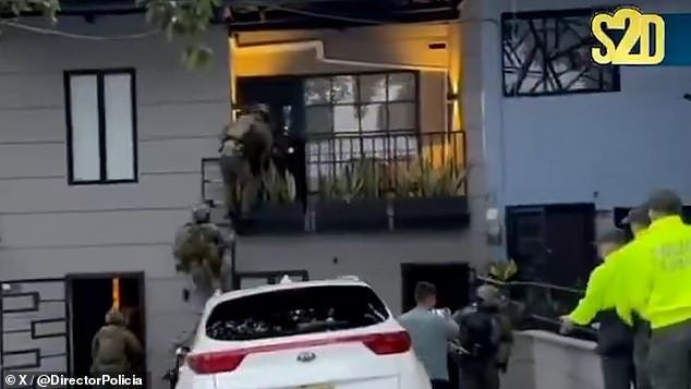 Agentes de policía fuertemente armados fueron filmados subiendo escaleras para acceder al piso superior de una propiedad en la ciudad de Medellín, mientras otros agentes entraron a la fuerza por una puerta en la planta baja con las armas en alto.