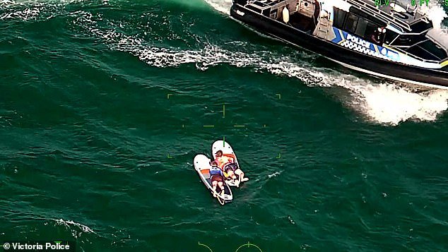Las imágenes, publicadas por la policía de Victoria, muestran el momento en que los servicios de emergencia se acercaron a los dos hombres mientras estaban acostados sobre sus tablas de remo y pidieron ayuda.