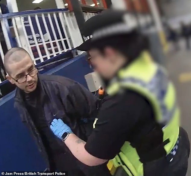 El pedófilo David Johnson aparece en la foto siendo arrestado por la policía que intervino después de que otro pasajero del tren lo vio viendo videos de abuso infantil.