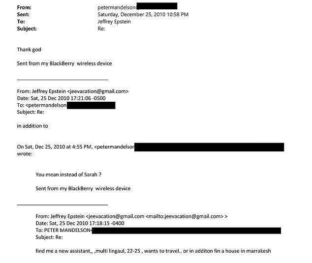 En un mensaje enviado al ex par laborista el 25 de diciembre de 2010, el financiero caído en desgracia escribió: “Búsqueme un nuevo asistente”, multilingüe, de 22 a 25 años, quiere viajar… o incluso encontrar una casa en Marrakech (sic).