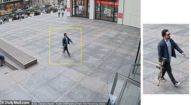 La cámara de seguridad publicada en línea muestra que los pistoleros llevaban un abrigo deportivo y una camisa con botones mientras llevaban un rifle grande cerca de un edificio de oficinas de Midtown Manhattan, donde hay Blackstone Asset Management y NFL el lunes.