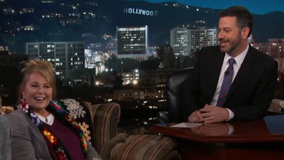 En marzo de 2018, Roseanne Barr y Jimmy Kimmel eran dos empleados de ABC charlando amigablemente en el programa de entrevistas de este último. (Crédito de la imagen: ABC)
