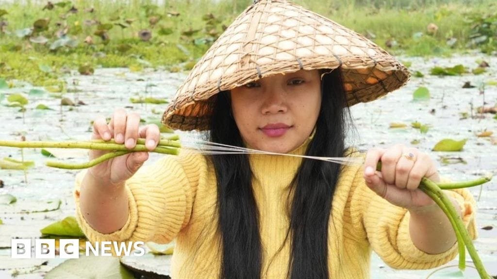 Botanista de profesión, la Sra. Tongbram creó una forma de extraer fibras como seda de los tallos de loto y ahora dirigió a un grupo de 30 mujeres en su pueblo que giran los hilos en un hilo y tejen sus bufandas y ropa únicas.