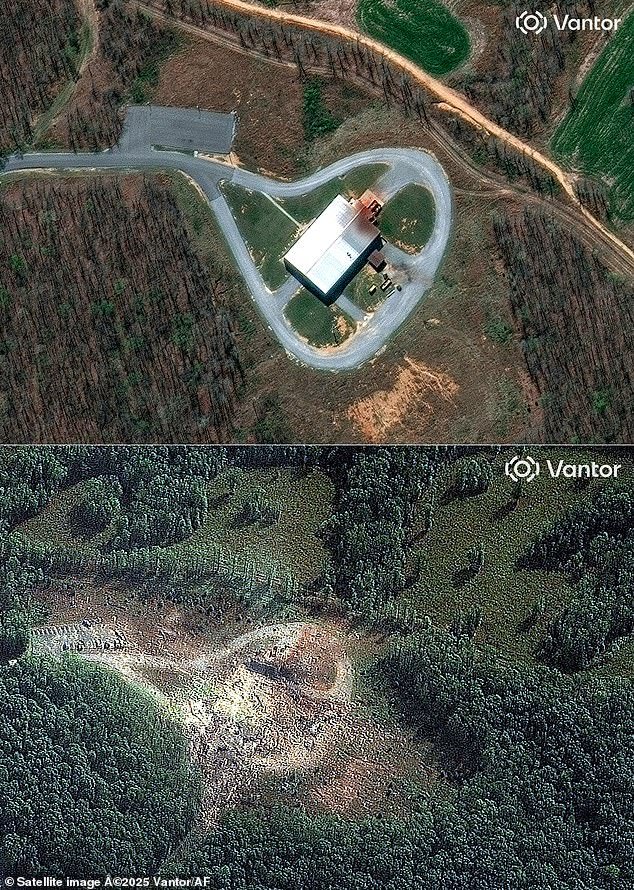 Las imágenes de satélite de antes y después de la explosión muestran claramente cómo la fábrica de bombas, conocida como Melt Pour, quedó completamente diezmada por la explosión.