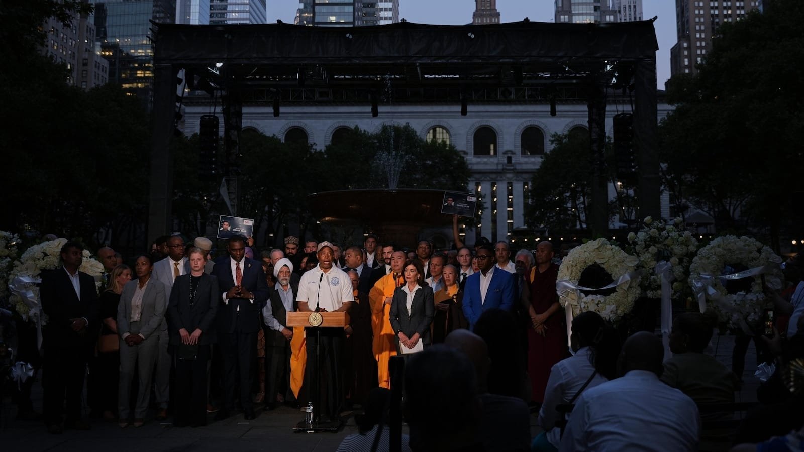 Los musulmanes, sijs, budistas, hindúes, cristianos y otros líderes de la fe rezaron a una docena de cuadras en un parque el martes por la noche por el tiroteo.