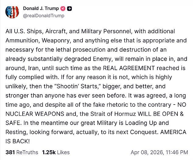 “Todos los barcos, aviones y personal militar estadounidense, con municiones, armas adicionales y cualquier otra cosa que sea apropiada y necesaria para la persecución asesina y la destrucción de un enemigo ya significativamente degradado, permanecerán en Irán y sus alrededores hasta que se respete plenamente el REAL DEAL”, escribió en un artículo de Truth Social el miércoles por la noche.