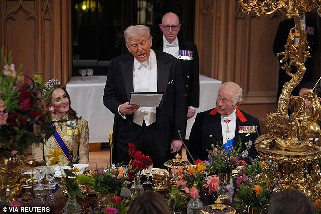 El presidente Donald Trump felicitó a la princesa “radiante” y “en buena salud” Kate cuando entregó un brindis el miércoles por la noche al rey Charles durante un suntuoso banquete del estado en el castillo de Windsor.