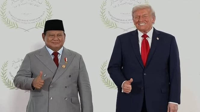 Trump conversó brevemente con Prabowo y posó felizmente sonriendo con Prabowo. También estuvieron presentes el emir de Qatar, jeque Tamim bin Hamad Al Thani, y el presidente turco, Recep Tayyip Erdogan.