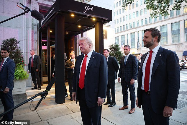 El presidente Donald Trump (centro) se encuentra fuera de los mariscos de Joa, Washington en los suburbios, así como al secretario de estado de DC (izquierda) Marco Rubio, el secretario de trabajo Pit Hagsath y el vicepresidente JD Vans antes de la cena el martes por la noche