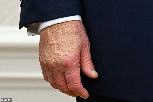 Durante su segundo mandato, Trump aparecía regularmente con moretones en la mano derecha, a veces ocultos por mucho maquillaje. La Casa Blanca dijo que estaba relacionado con la aspirina que toma como parte de un programa de salud cardiovascular “estándar”.